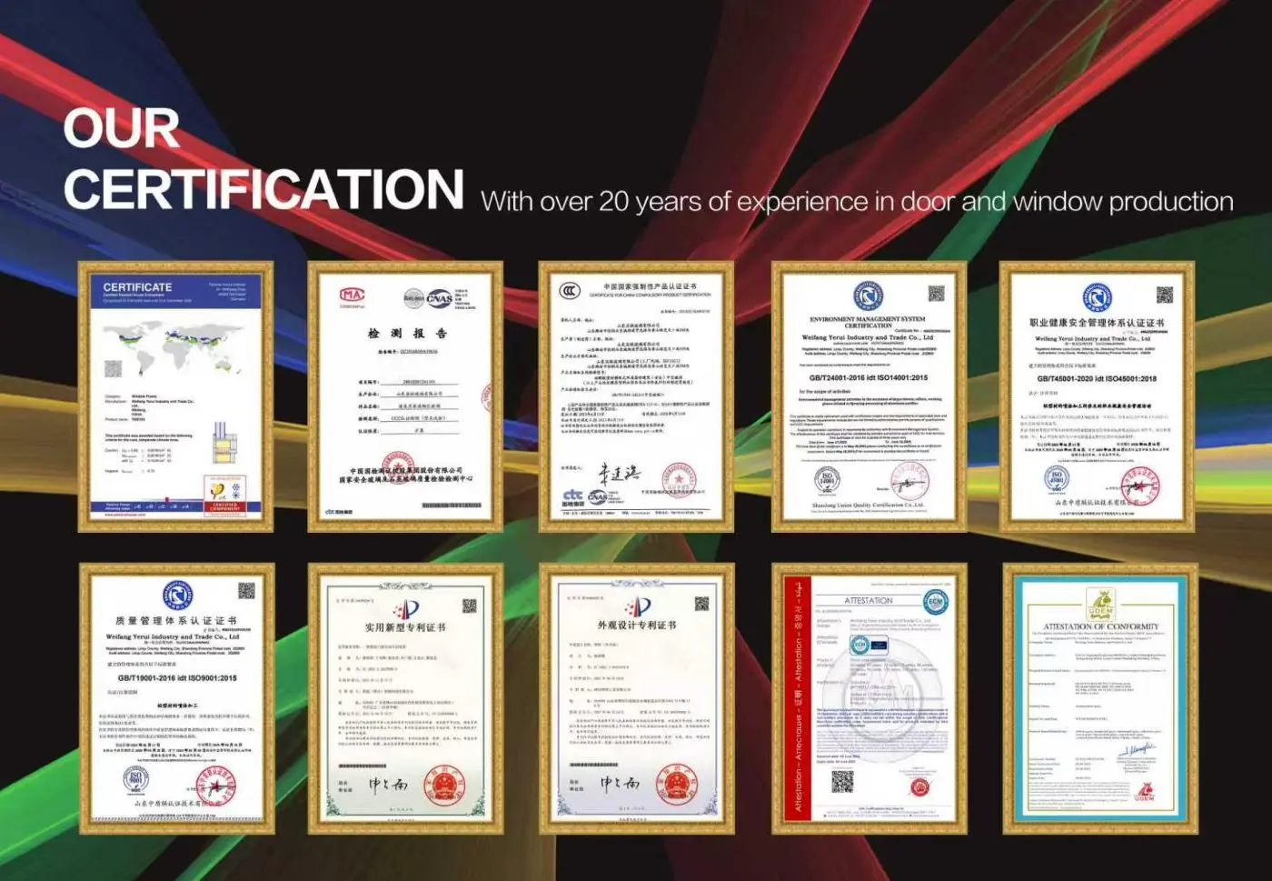 Weifang Yirui Industry and Trade Co., LTD. παράγει κυρίως προφίλ κτιρίων, βιομηχανικά προφίλ, προφίλ κουρτινών και πορτών και παραθύρων στήριξης, πυρίμαχο γυαλί, σκληρυμένο γυαλί, μονωτικό γυαλί LOW-E εξοικονόμησης ενέργειας, πολυστρωματικό γυαλί, γυαλί άκρων ακριβείας κ.λπ., και επίσης κατασκευάζει σύστημαπόρτες και παράθυρα, πτυσσόμενες πόρτες και παράθυρα, ηλεκτρικά παράθυρα, αυτόματες ηλεκτρικές πόρτες, επαγγελματικές πόρτες, συρόμενες πόρτες, ξαπλώστρες, περίπτερα, ράφια λουλουδιών αλουμινίου, παράθυρα κινέζικου τύπου, παράθυρα ευρωπαϊκού τύπου καθώς και κάγκελα αλουμινίου καιγυάλινα κάγκελακατάλληλο για εσωτερική και εξωτερική χρήση, τα οποία έχουν καλή αντοχή στη διάβρωση εξωτερικού χώρου και υψηλό συντελεστή ασφάλειας εσωτερικού χώρου και όλα τα προϊόντα μπορούν να προσαρμοστούν σύμφωνα με τις διαφορετικές απαιτήσεις πελατών.